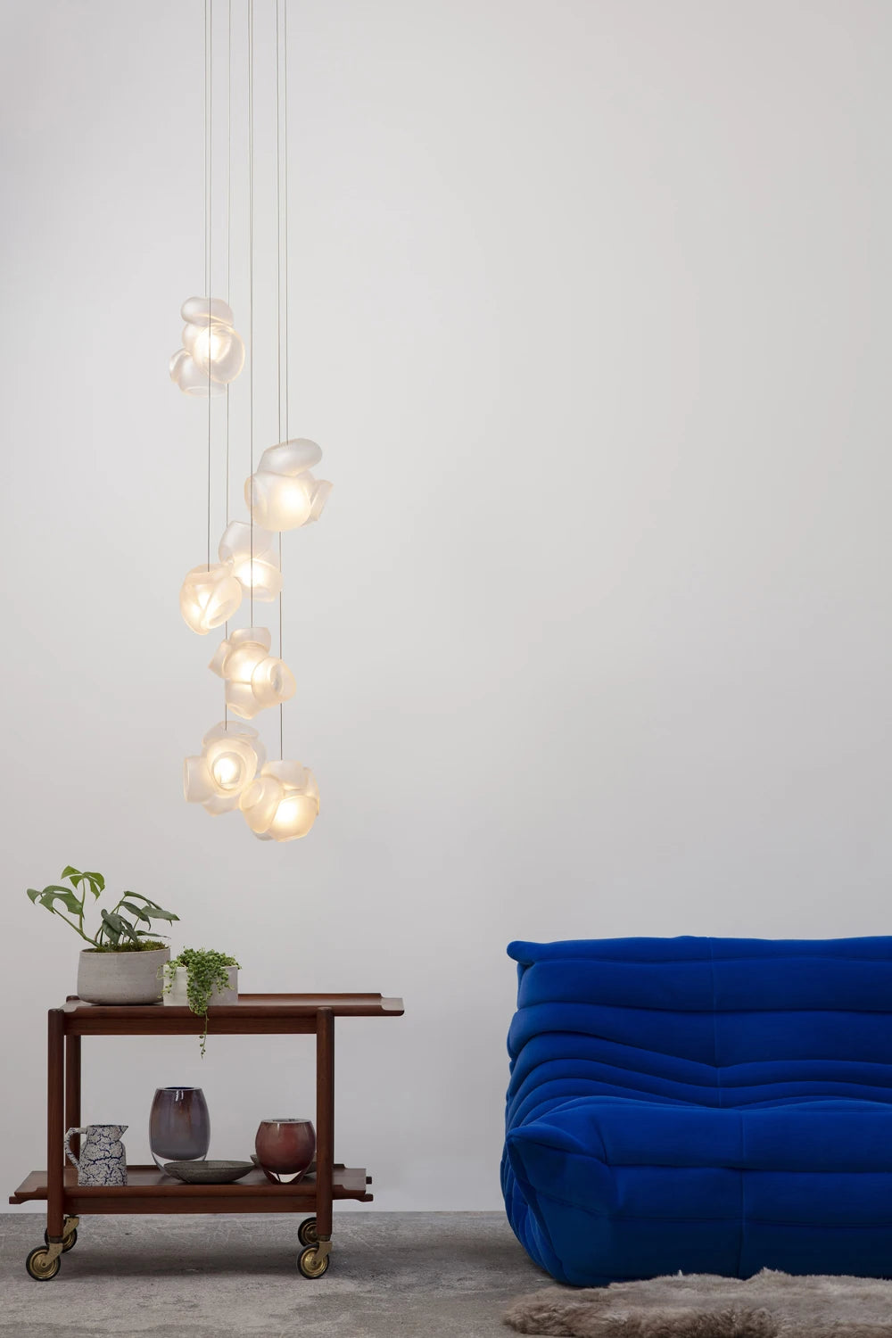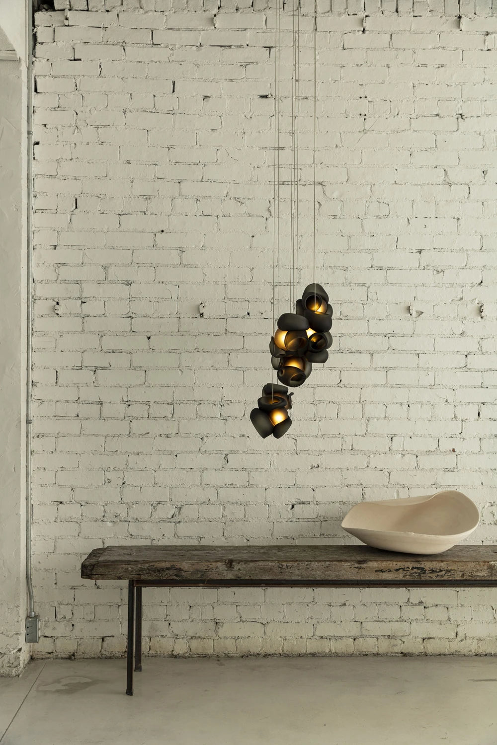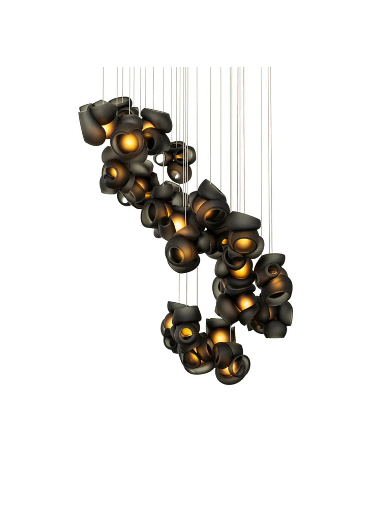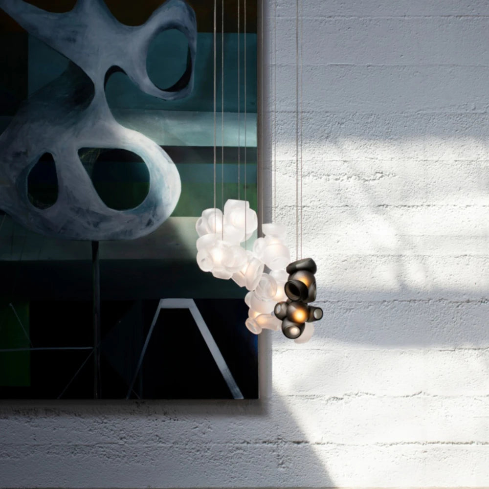 The Bocci 100 style Pendant Lamp reimagines the lamp as a sculptural objet — an intimate interplay between material, craft, and light. Designed by Omer Arbel for Bocci’s 100 Series, this piece begins as a unique cluster of hand-blown glass forms, created through a collaborative glassblowing process where multiple artisans shape, fuse, and refine molten glass into unpredictable, interlocking forms. This distinctive method reveals an intricate interior landscape, lending each lamp its own singular character and depth.