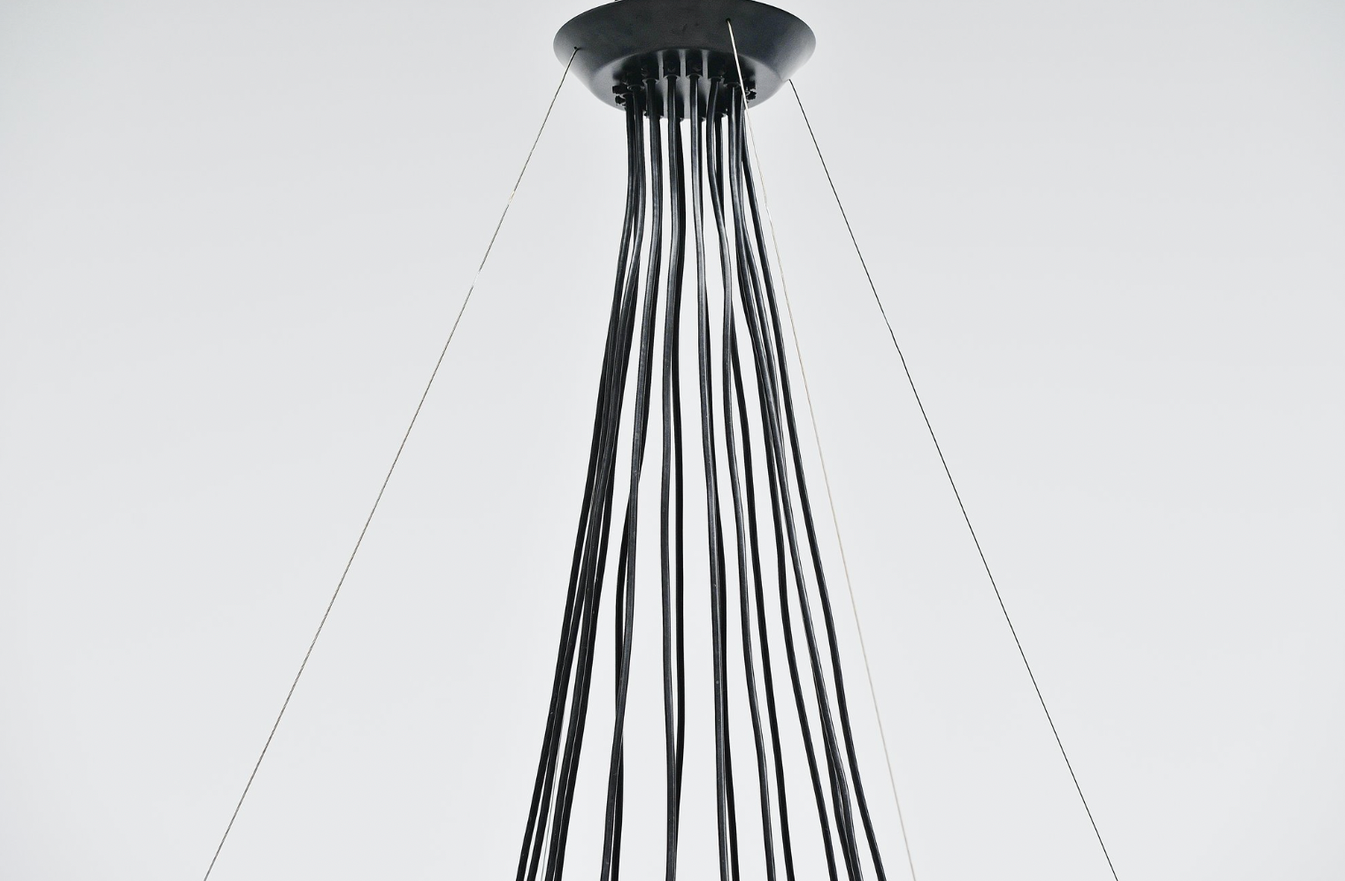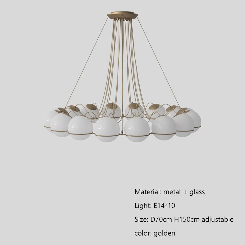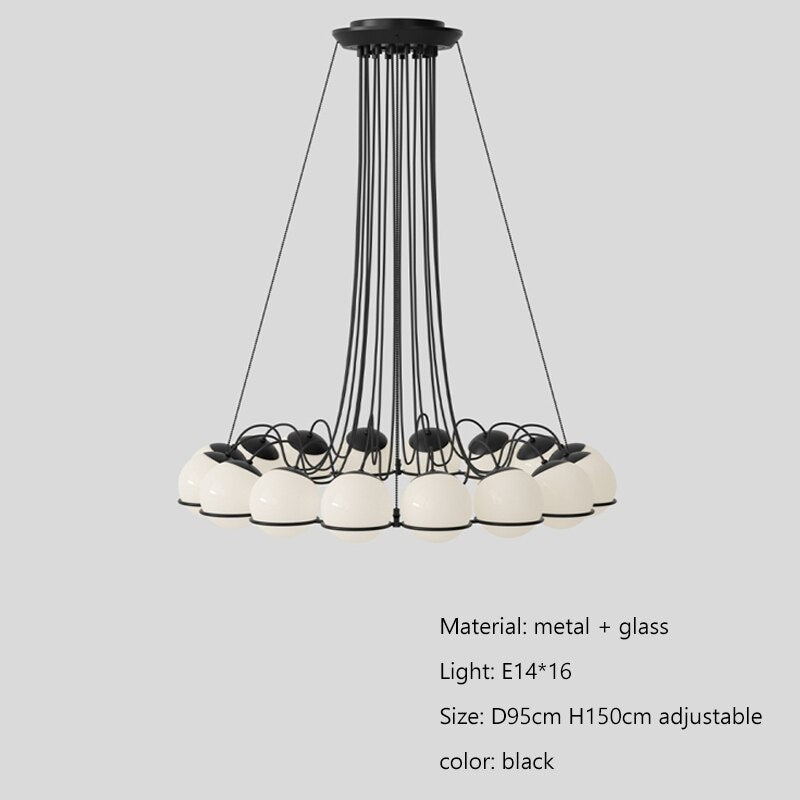 The Model 2109 style pendant lamp is composed of 16 round opal glass diffusers, steel ring structures and freely hanging black cables. You can place the glass spheres on the rings either way around and thus alter the chandelier's look and intensity of light. Due to its bold size and stunning expression, the Model 2109 works especially well in high spaces such as living rooms and lobbies.