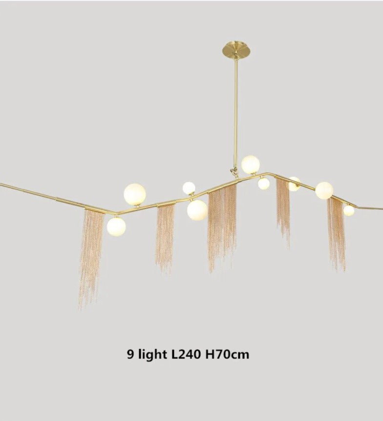 Cherry Bomb Fringe style Chandelier is inspired by Alexander McQueen’s ravaged, rough-hemmed dresses, may be the ultimate expression of the form: Gold-filled jewelry chains cascade from the frame, like Spanish moss. Combining poetry and illumination in a striking, delicate balance.