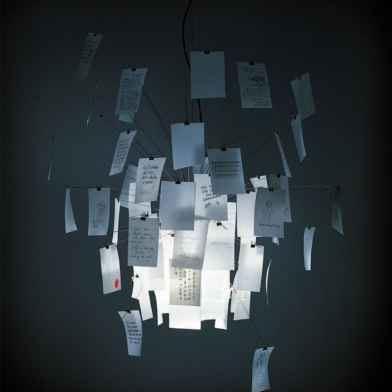 Stainless steel, heat-resistant satin-frosted glass, thin Japanese paper. The Zettel'z 5 is one of Ingo Maurer’s best known lamps. It gives the user plenty of room for his or her own creativity, and can be set up so that it is space-consuming and loose or narrow and dense. You can also use your own photos and creations.