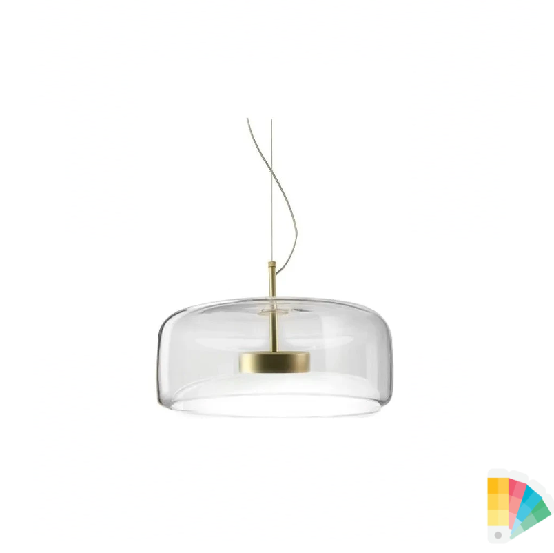 The Jube style Pendant is a design chandelier in vintage style. This suspension lamp is characterised by a blown glass diffuser, which takes shape from the superposition and fusion of two glasses. The effect created is a tone on tone that gives the lamp a retro look. The lower glass is white while the upper part is available in the following shades: smoky, burnt earth, antique green, crystal. The metal parts are in satin gold. The Jube style Pendant has a LED light source.