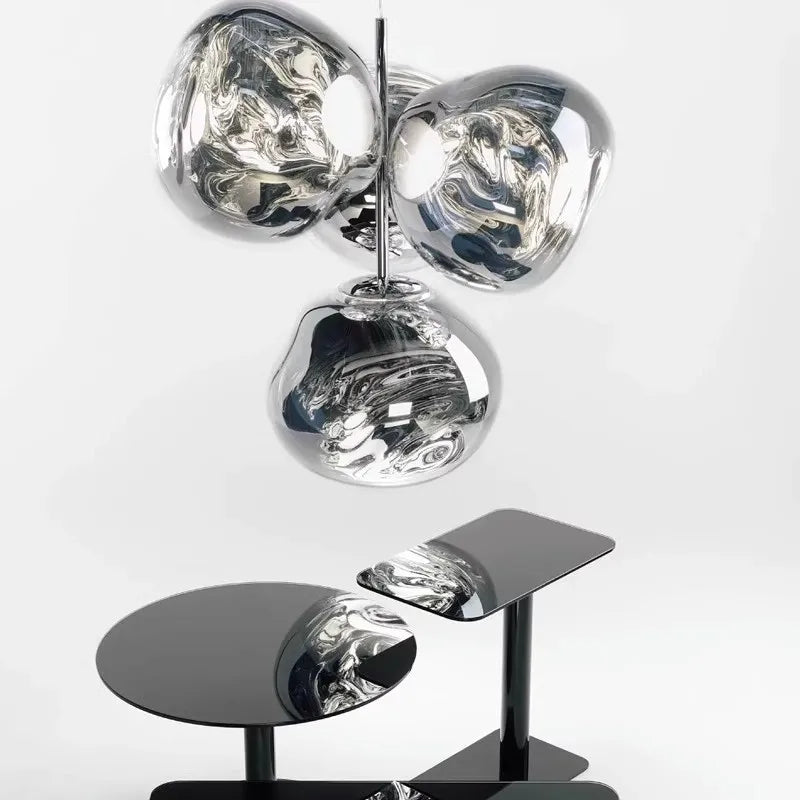 This incredible, modern take on a chandelier boasts spectacular dimensions! Melt style Chandelier is a bunch, or a bouquet of four globes which burst out from a central core to create a luminous and dynamic sculpture with infinite reflections. With their soft and curved, organic shape, the globes resemble droplets or water or fusing metal! The Melt style Chandelier creates a stunning and somewhat hypnotising optical illusion. This very special metallic finish allows Melt to change and look totally different! When the light is switched off, the metallic globes are opaque and reflective. Once the light is switched on, they turn translucent, like glass. The material is dressed in beautiful deep reflections, playing with light, colour, transparency and depth.
