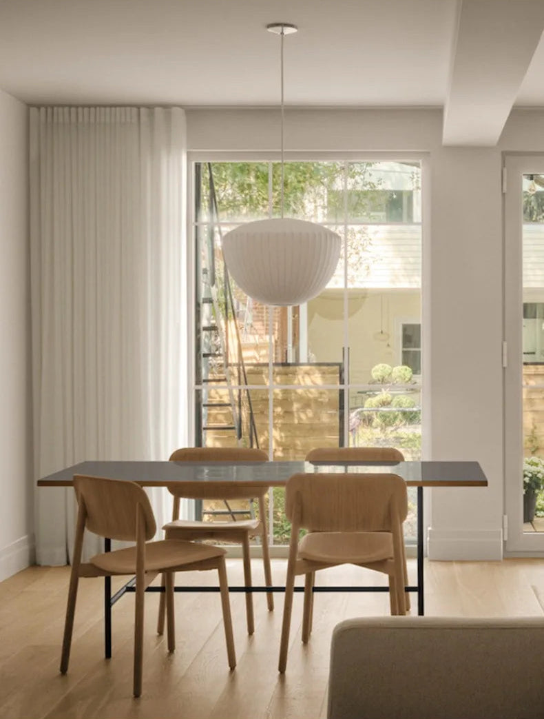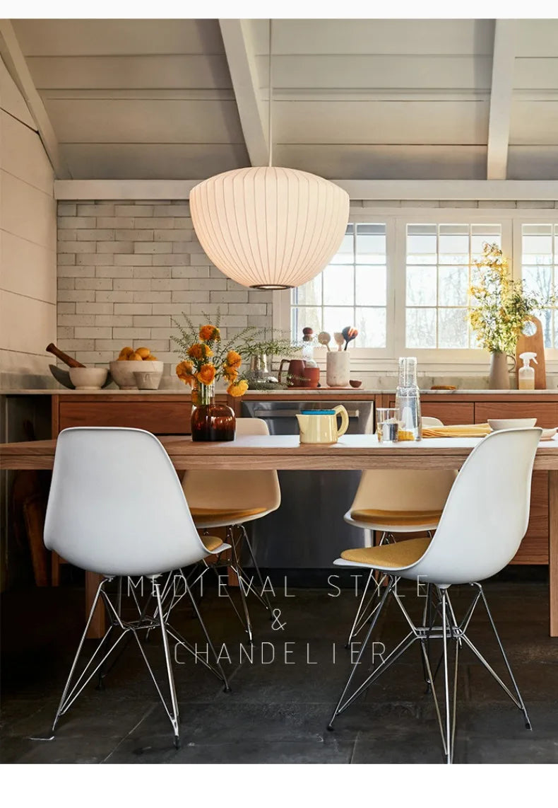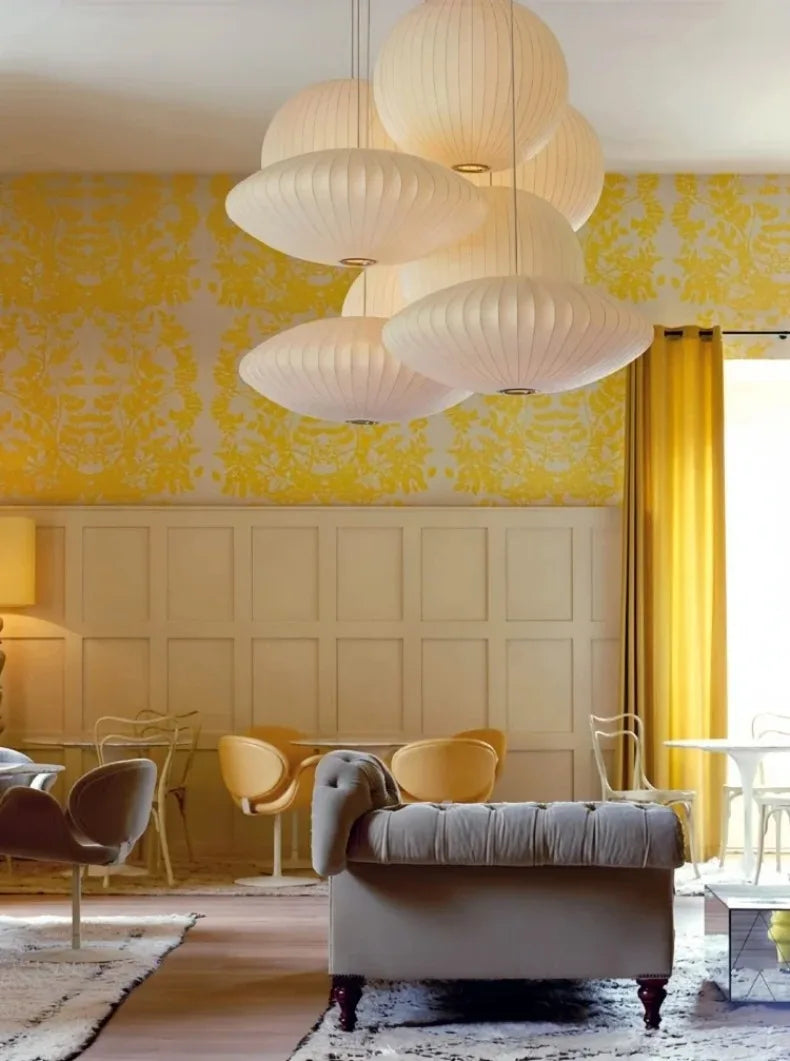 The Apple Bubble style pendant is inspired of the Bubble Nelson collection, where the designer took inspiration from Swedish ceiling lights upholstered in silk that he wanted to acquire for his office.