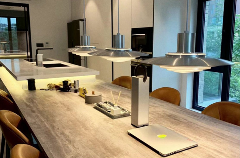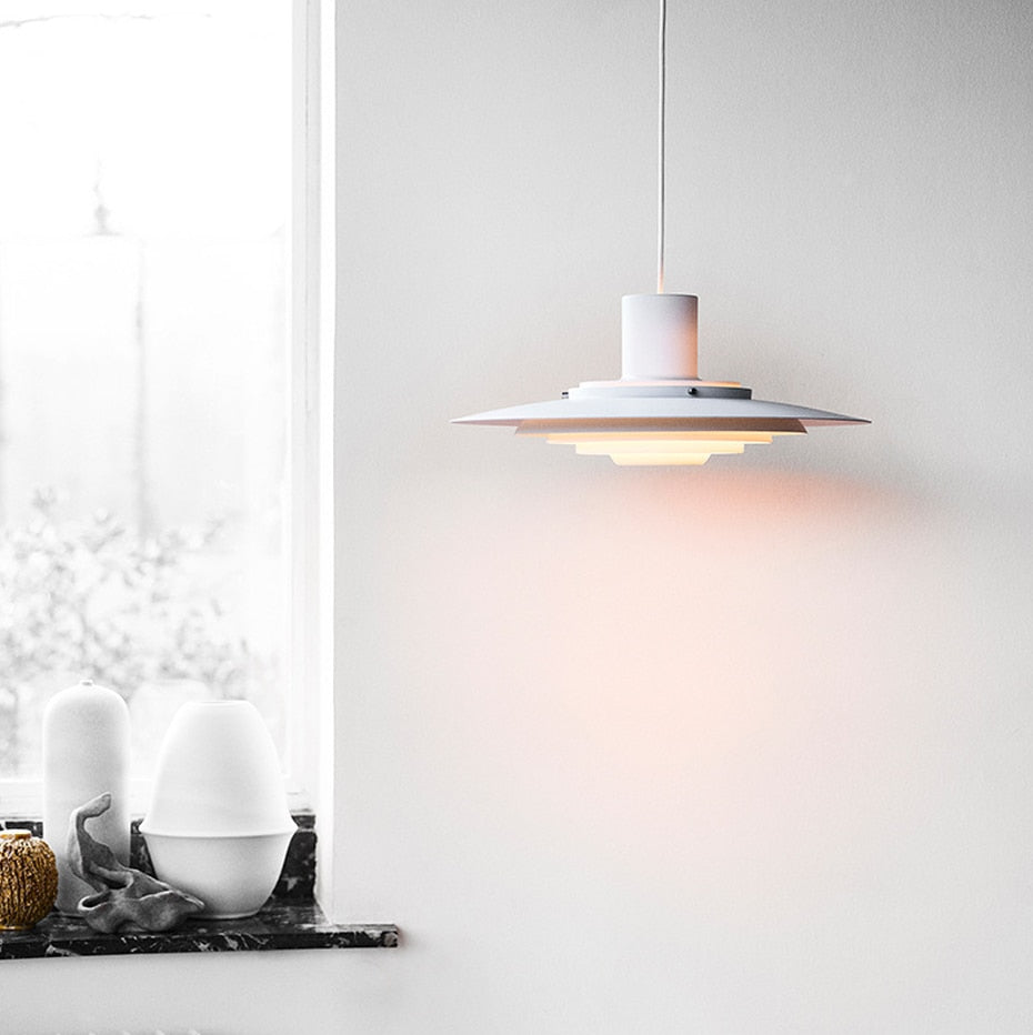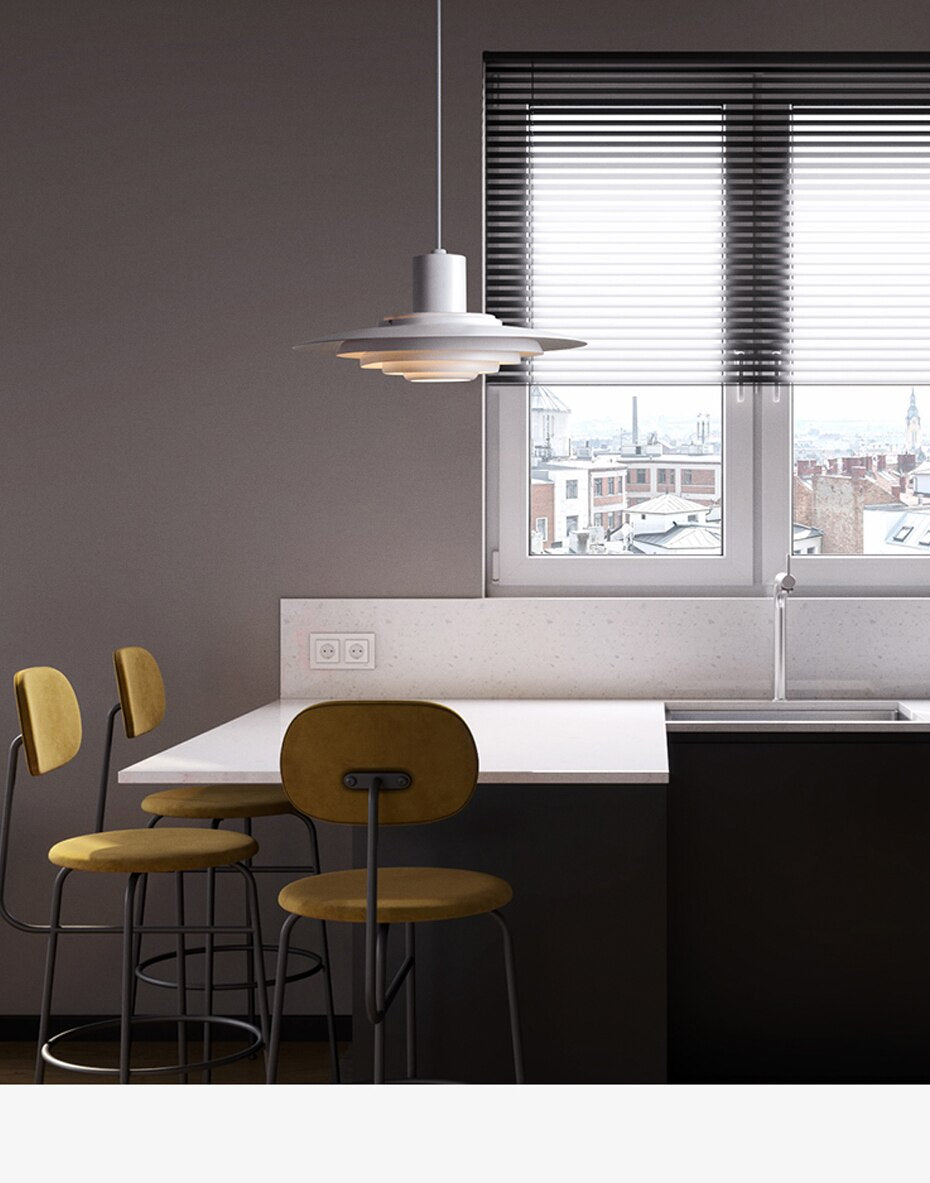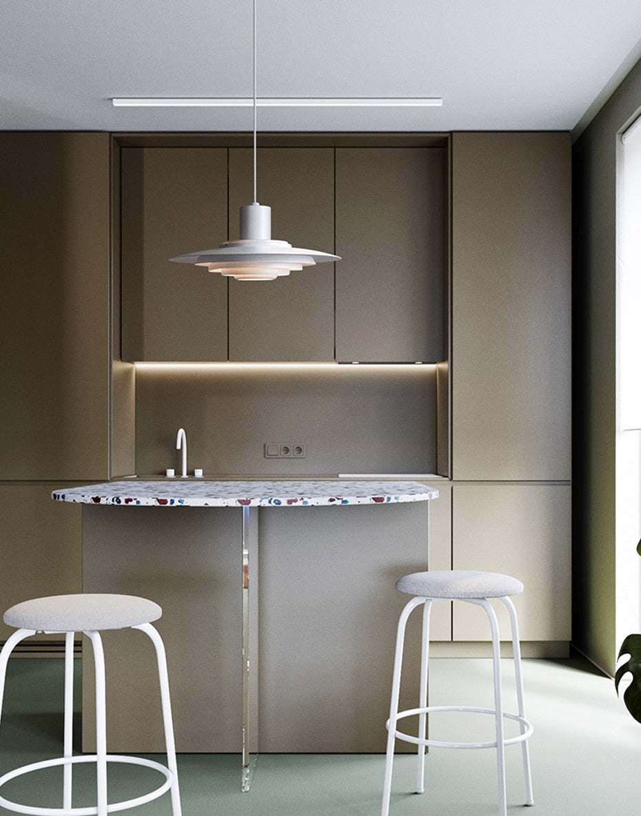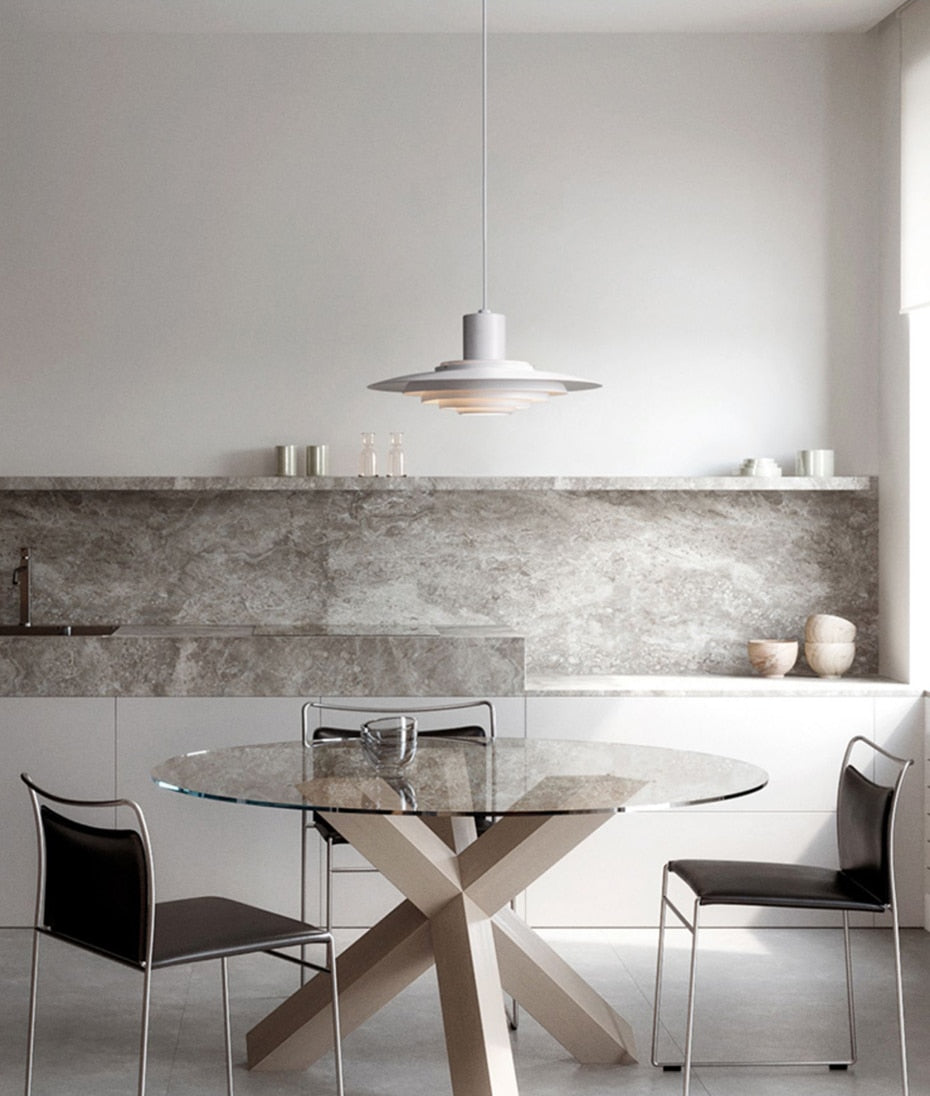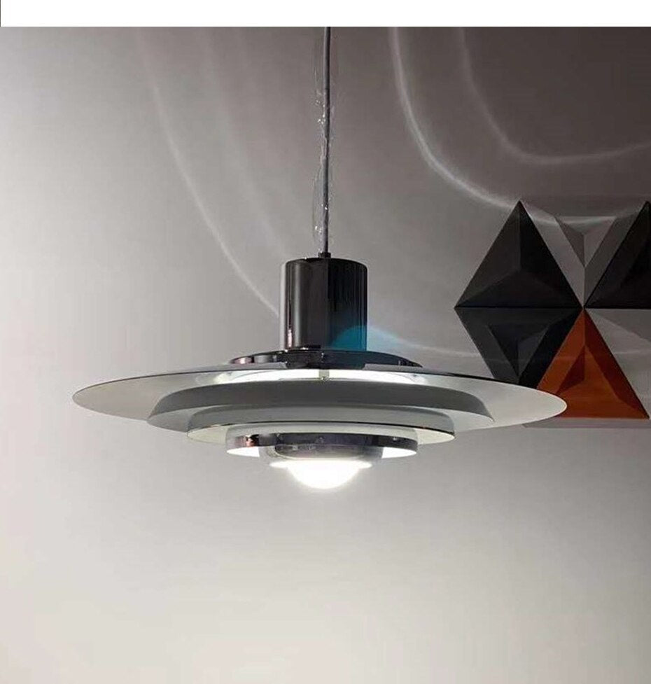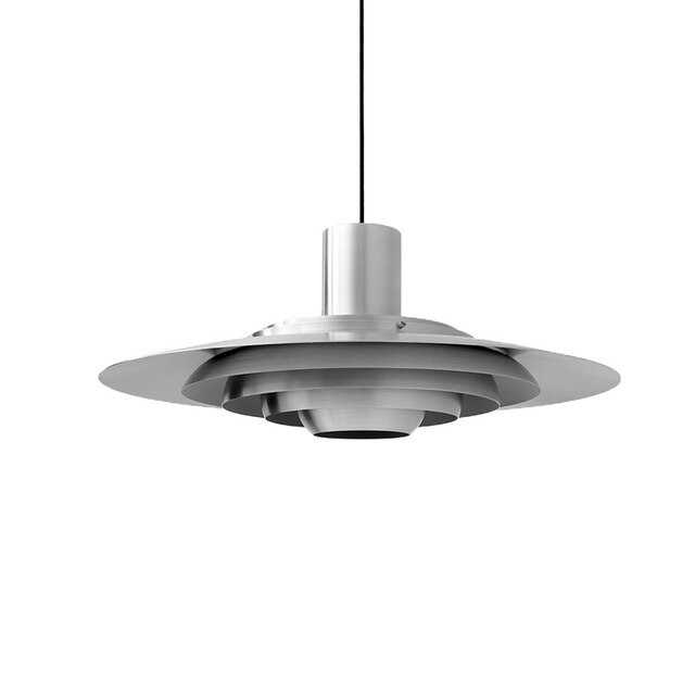 Produced for the first time in 1963, the P376 pendant has now been reissued. This reissue of the P376 pendant preserves the authenticity of the original design, optimised to emit diffuse, glare-free lighting. The P376 pendant is made up of five concentric metal circles. It is surmounted by a cylindrical section which conceals the bulb. The aluminium finish adds a modern, industrial aspect that contrasts perfectly with the retro shape.