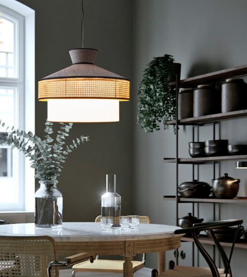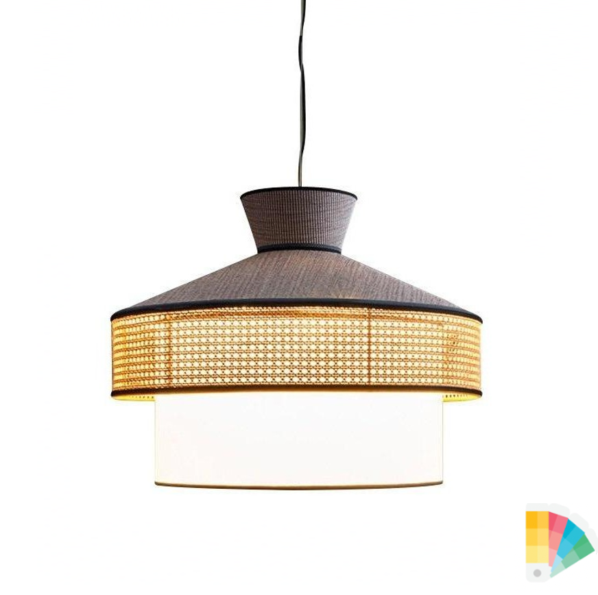 The Wagasa style Pendant is boasting elegant and sophisticated contrasts that will enliven both a classic and contemporary decor, this lamp features a geometric silhouette that evokes Japanese minimalism. The larger ring is covered in Viennese straw, while the conical top and cylindrical bottom are upholstered in weightless rice paper, for a delicate shading effect.